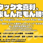 「タッグ大喜利、楽しんだもん勝ち!」 タッグ大喜利、楽しんだもん勝ち! 【日時】12月17日 (水) 18:30開場/19:00開演 【料金】前売料金 最前列 2,000円/通常 1,500円 当日+500円 【会場】 ターミナル […] 公開済み: 2025年11月17日更新: 2025年11月28日作成者: concarino_otaカテゴリー: イベント, お笑い